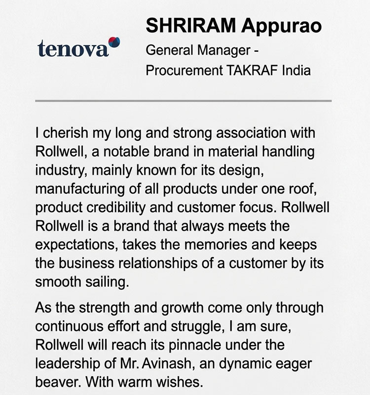 ROLLWELL’s growth and success are driven by the continued trust and support of its valued clients. The organization is led by a team of highly experienced management and engineering professionals with deep domain expertise in the bulk material handling industry. Backed by over 3,000 man-years of cumulative experience, Team ROLLWELL excels in experiential knowledge, product intelligence, customer-centric solutions, manufacturing excellence, and advanced design competence. This strong foundation enables the company to deliver superior-quality products and turnkey solutions that consistently meet and exceed the technical and commercial expectations of its customers worldwide.